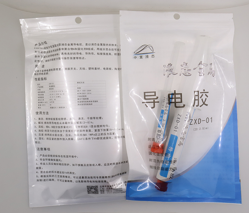 液態(tài)金屬導(dǎo)電膠是以液態(tài)金屬作為導(dǎo)電填料,與基體樹脂混合制備而成的干燥固化后具有一定導(dǎo)電、導(dǎo)熱性能的膠粘劑。